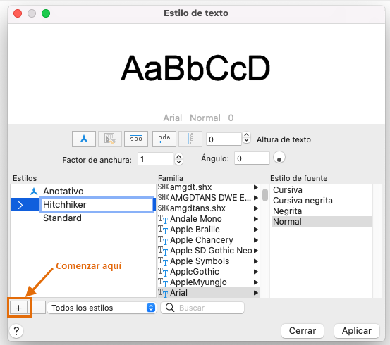 Al crear un estilo de texto nuevo, debe darle un nombre y, a continuación, seleccionar un tipo de letra y su estilo.