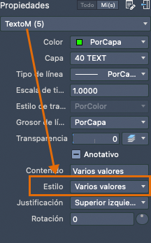 Al igual que otros elementos de anotación, el texto de líneas múltiples proporciona una gran cantidad de parámetros. Puede guardar estos parámetros como un estilo de texto mediante el comando ESTILO y, a continuación, acceder a los estilos de texto guardados. Para ello, haga clic en la flecha de lista desplegable Estilo de texto en la paleta Inspector de propiedades. El estilo de texto actual se muestra en la paleta Inspector de propiedades cuando no hay ningún objeto seleccionado.