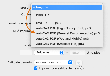 En la lista desplegable Impresora/trazador, elija AutoCAD PDF (general documentation).pc3: