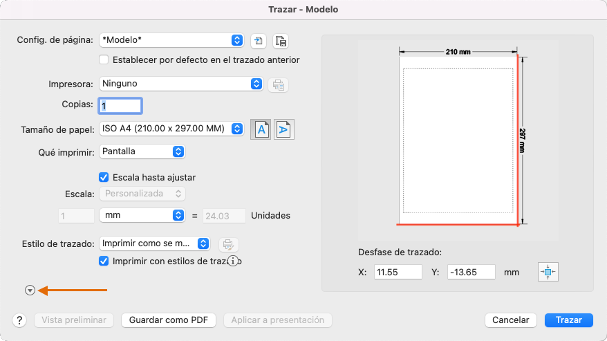 Para determinar si se muestran o se ocultan todas las opciones del cuadro de diálogo Trazar, haga clic en la flecha que se indica para expandirlas.