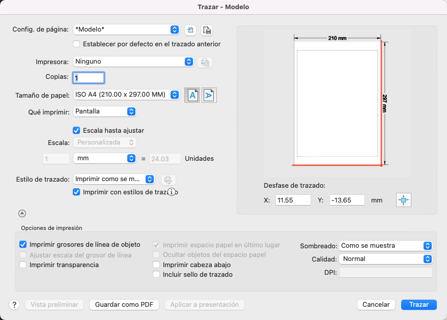 Para mayor comodidad, puede guardar y restablecer las colecciones de estos parámetros por nombre. Estas restricciones se denominan configuraciones de página. Con las configuraciones de página se pueden almacenar los parámetros necesarios para diferentes impresoras, la impresión en escalas de grises, la creación de un archivo PDF a partir de un dibujo, etc.