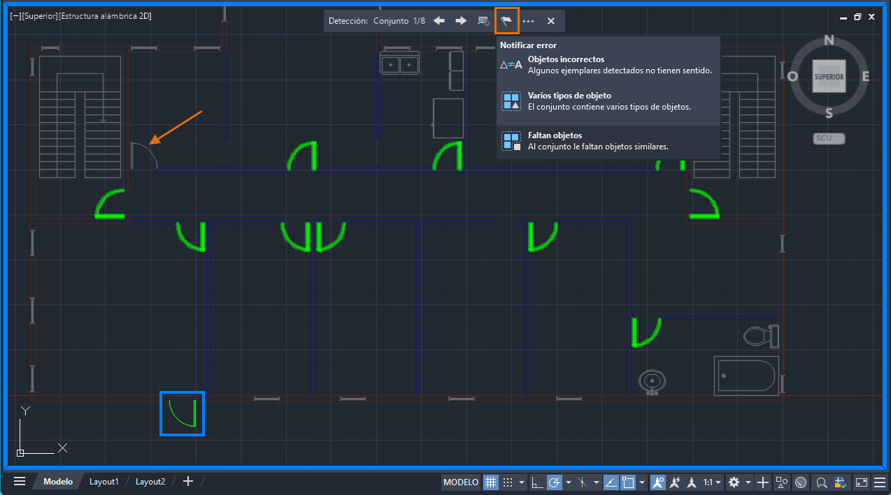 En el modo de revisión, se muestra la barra de herramientas de detección en la parte superior de la ventana de dibujo. Esta proporciona varias opciones para desplazarse por los resultados de la detección y gestionarlos. Los resultados de la detección se agrupan en conjuntos de objetos similares. Un conjunto representa un grupo de objetos detectados similares que se pueden convertir en ejemplares de un único bloque.