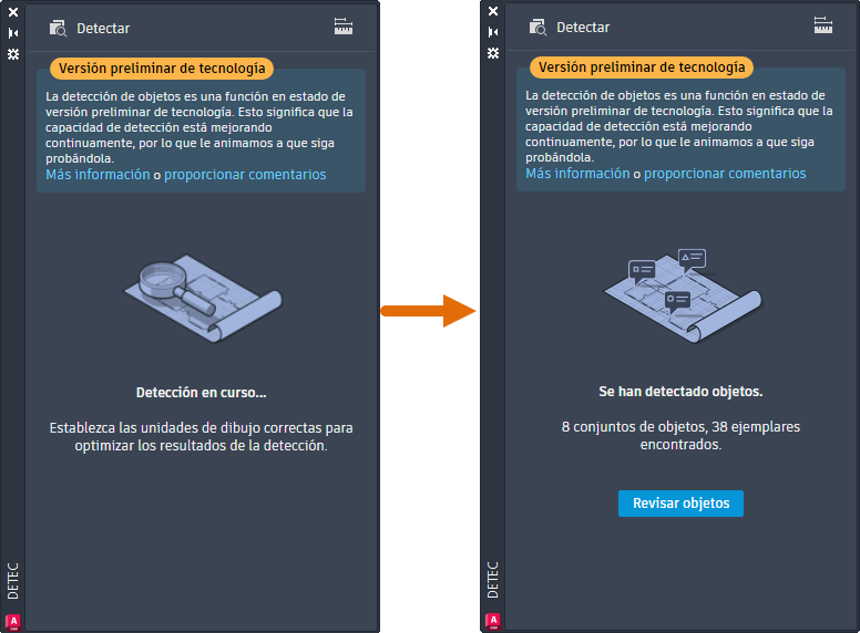 Al iniciar la detección de objetos, la geometría del dibujo se envía al servicio de aprendizaje automático de AutoCAD para su reconocimiento. Una vez que el servicio haya analizado el dibujo, la paleta le notificará si se ha detectado objetos que se puedan convertir en bloques. Para inspeccionar y evaluar los ejemplares identificados, haga clic en Revisar objetos.