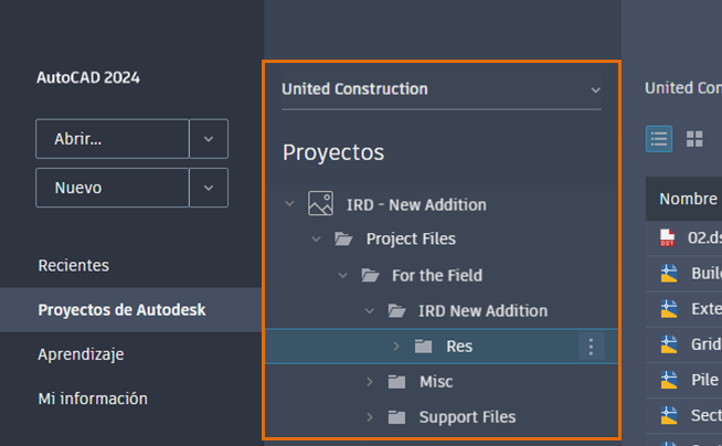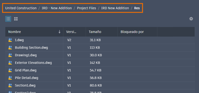 - Encima de la lista de dibujos del proyecto, se muestra el camino de navegación de la ruta de proyecto actual.