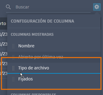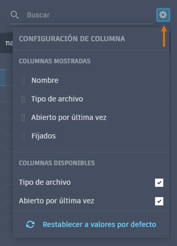 - En la vista de lista, puede personalizar los encabezados de columna. Para ello, haga clic en la configuración. Las columnas Nombre y Fijado son permanentes.