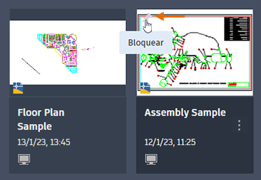 - El icono del menú Abrir aparece al colocar el cursor sobre una miniatura del dibujo. Haga clic para visualizar las opciones en el menú.