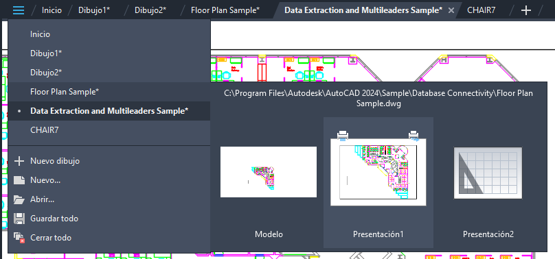 Utilice el nuevo menú de la ficha Archivo para alternar entre dibujos, crear o abrir un dibujo, guardar y cerrar todos los dibujos, y mucho más.