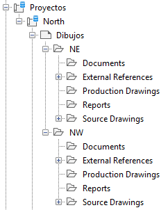Como se muestra en la figura 2, los proyectos NE y NW están dentro de un único proyecto de Vault denominado North. Las referencias a Vault pueden conducir a cualquier objeto de la carpeta de proyecto de North. Si fuese preciso extender estas referencias a otros proyectos, cree nuevas carpetas para estos proyectos dentro de la carpeta de trabajo del proyecto North. Replique la estructura de proyecto en Vault, mediante la herramienta de administración de Autodesk Vault. Puede utilizar las subcarpetas de un proyecto para organizar las carpetas de dibujos y documentos, pero no otros objetos del proyecto, como los vínculos de referencia de Prospector o los archivos de base de datos de Vault (PointsStatus.mdb, PointsGeometry.mdb, Survey.sqlite y Survey.sdxx).