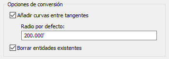 Si activa la casilla Añadir curvas entre tangentes, obtendrá una alineación con curvas libres insertadas en el punto de unión de dos segmentos rectos. Editar estas curvas libres resulta sencillo, ya que conservan siempre la tangencia. Si la polilínea de entrada incluye arcos, éstos se convierten en curvas fijas en la alineación, que no conservan la tangencia en la edición. Mantenerlas como curvas fijas no generará ningún problema si no se necesita editarlas. Una alternativa es suprimir estas subentidades de curvas fijas e insertar una curva libre entre las entidades adyacentes. Así, si se necesita editar la alineación, la curva libre conserva la tangencia.
