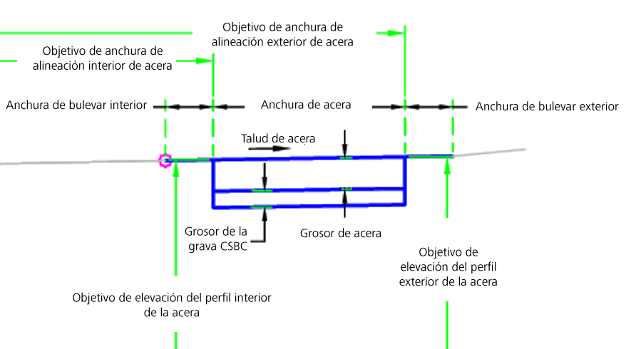 Perfil interior de acera Se puede utilizar para modificar el valor de elevación de la acera interior. Los tipos de objeto siguientes se pueden utilizar como destinos para especificar la anchura: alineaciones, polilíneas, líneas características o representaciones topográficas. Opcional