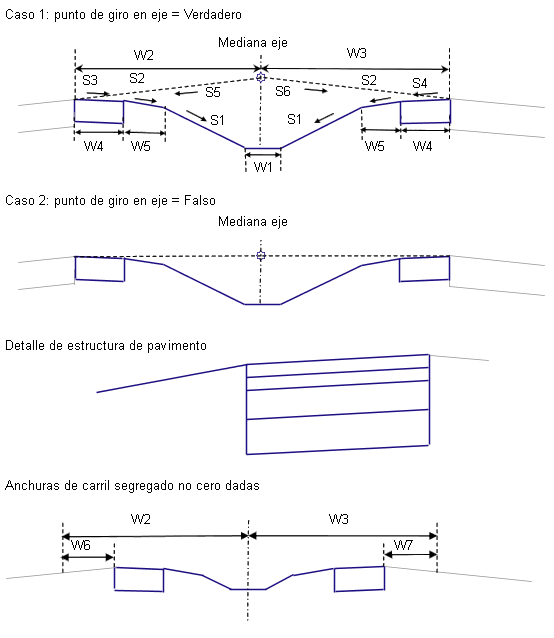 La mediana se puede configurar de manera que el punto de giro de peralte se encuentre en el eje o en los bordes interiores de las calzadas. Si se usa el giro de eje, los taludes de peralte de los carriles exteriores izquierdo y derecho se obtienen a partir de las especificaciones de peralte de la línea base, y las elevaciones de los bordes interiores de las calzadas se calculan aplicando estos taludes a las anchuras de la mediana izquierda y derecha desde el punto de enlace. Si no se usa el giro de eje, los bordes de las calzadas se mantienen en la elevación del punto de enlace.