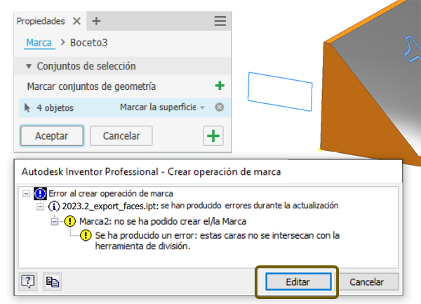 Algunas condiciones pueden dar como resultado un mensaje de error, por ejemplo, cuando una edición hace que la geometría del boceto ya no se encuentre sobre la geometría del modelo. Cuando esto sucede, puede editar el boceto desde el cuadro de diálogo de error y resolver rápidamente el problema.