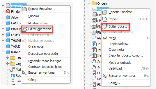 Ahora es posible utilizar las teclas de método abreviado del menú contextual para editar bocetos u operaciones directamente. Seleccione una operación o un boceto, haga clic con el botón derecho y utilice la tecla de método abreviado. Están disponibles las siguientes teclas de método abreviado: