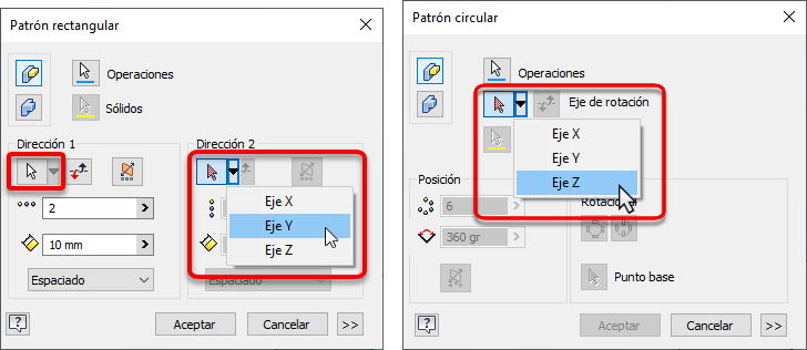 Los comandos de patrón de operaciones, Rectangular y Circular, ahora tienen un icono desplegable de opciones seleccionables que da acceso a los ejes de origen.