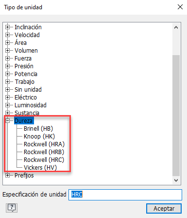La dureza es un tipo de unidad totalmente nuevo que se ha añadido a esta versión de Inventor. Esta opción permite especificar la dureza en el comando Acabado, pero también se puede utilizar de manera independiente. Los siguientes tipos están disponibles en el cuadro de diálogo Parámetros: