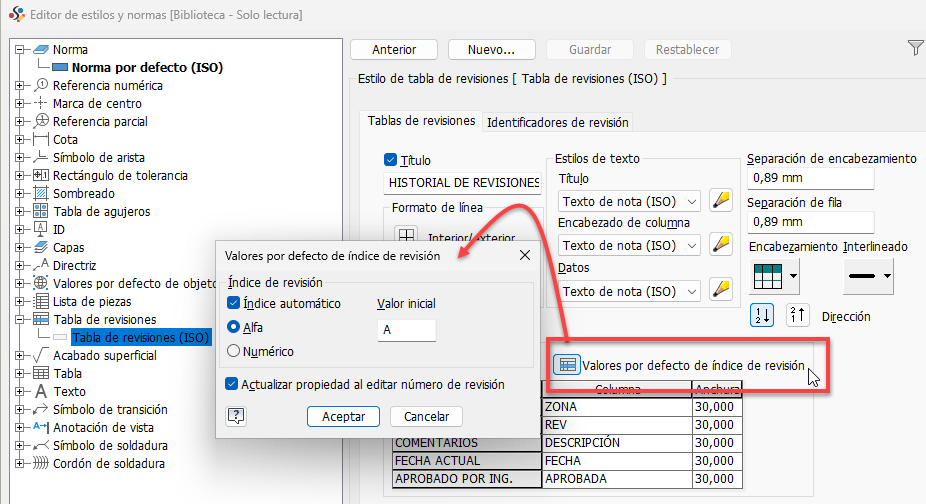 Ahora es posible especificar la numeración por defecto (alfanumérica o numérica) desde una plantilla de dibujo en lugar de a través de la propia tabla de revisiones. Se ha añadido una nueva opción "Valores por defecto del índice de revisión" al "Editor de estilos y normas" para las tablas de revisiones.