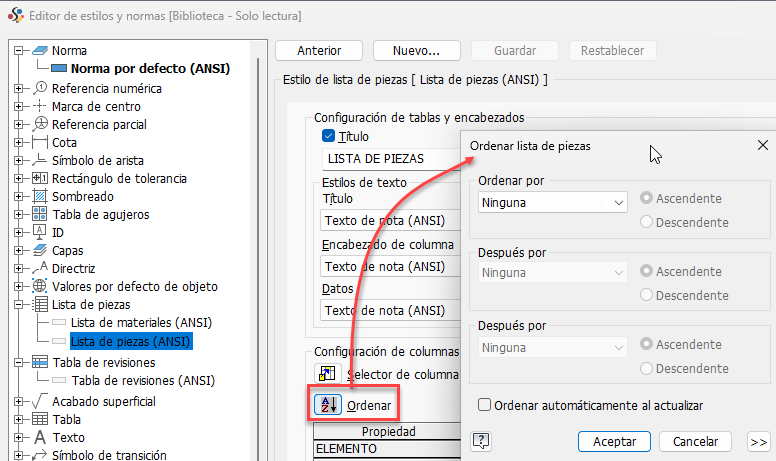 Ahora es posible especificar el orden de clasificación de los elementos de la lista de materiales para las listas de piezas directamente en el Editor de estilos mediante la nueva opción "Ordenar".