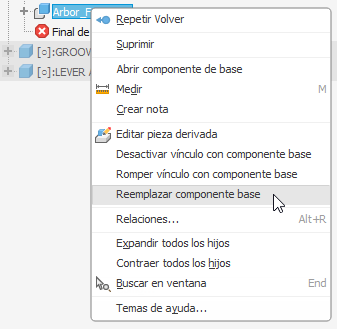 Ahora puede reemplazar el componente base de una pieza o un ensamblaje derivado desde el ensamblaje padre mediante Reemplazar componente base.