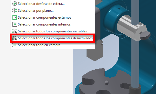 Una nueva opción "Seleccionar todos los componentes desactivados" permite seleccionar todos los componentes desactivados de un ensamblaje para que se puedan activar o desactivar. Puede acceder a esta opción: