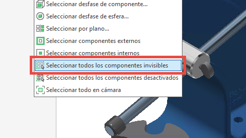 Ahora puede seleccionar todas las piezas de un ensamblaje que se hayan definido como Invisibles para que no tenga que seleccionar manualmente cada una de ellas en el ensamblaje o en el navegador. Utilice la opción "Todos los componentes invisibles" que acaba de añadir en el menú desplegable Selección, o bien la opción "Seleccionar todos los componentes invisibles" en la barra de herramientas de acceso rápido, o bien haga clic con el botón derecho con la tecla Shift.