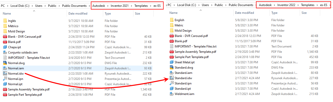 A partir de la versión Inventor 2022, todas las plantillas se llaman “Standard.xxx” durante la instalación. Este cambio es para las versiones localizadas de Inventor. Para utilizar plantillas localizadas creadas con una versión anterior a Inventor 2022, se recomienda cambiar el nombre de las plantillas antiguas por un nuevo nombre “Standard.xxx” como parte del proceso de migración de plantillas. Por ejemplo, cambie “Normal.idw” a “Standard.idw”.
