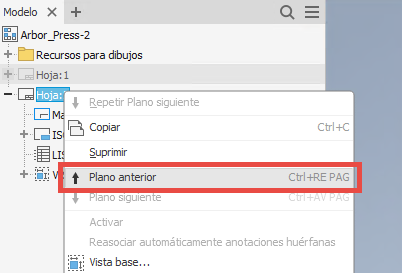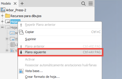 En las versiones anteriores de Inventor, era necesario hacer doble clic en el plano para activarlo. Ahora puede examinar varios planos de un dibujo mediante los comandos Hoja siguiente o Plano anterior, comenzando por el plano seleccionado. Si lo desea, puede asignar las teclas de método abreviado a estos comandos.