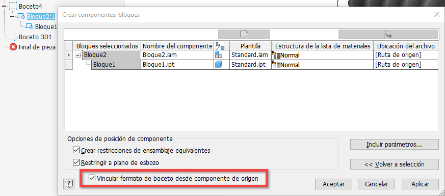 Se ha añadido una nueva opción "Vincular formato de boceto desde componente de origen" al cuadro de diálogo Derivar. Permite controlar si los bloques de boceto de la pieza derivada se actualizan si se modifican las líneas de la pieza de origen.