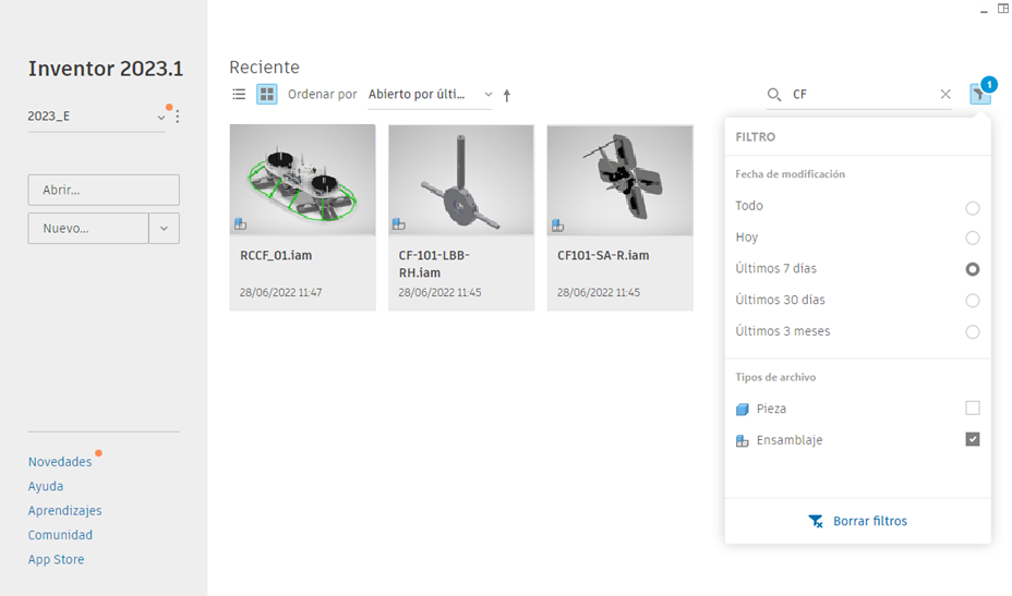 Filtre la lista Recientes y busque los resultados mediante los filtros predefinidos. Puede filtrar por Tipos de archivo, Fecha de modificación y borrar fácilmente los criterios de filtro.