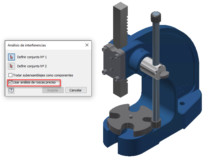 Cuando se crean agujeros con la operación de rosca, la rosca no siempre va desde el inicio del agujero hasta el final del agujero. Esto conduce a interferencias en el diseño. Ahora tiene la opción de excluir el análisis de profundidad de rosca extendida. Desactive la casilla "Usar análisis de rosca preciso" que se acaba de añadir en el cuadro de diálogo Análisis de interferencias.