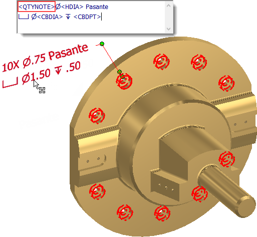 El resaltado transversal está activado para los agujeros que participan en una nota de agujero 3DA cuando se utiliza QTYNOTE.