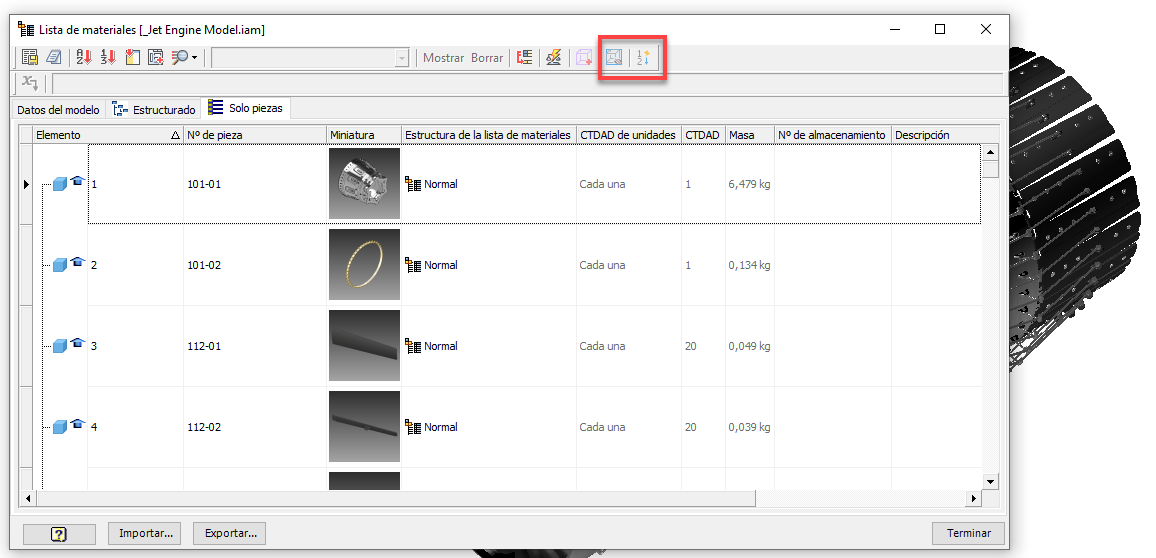 Se ha rediseñado el cuadro de diálogo Lista de materiales. Se añaden directamente a la barra de herramientas dos opciones para mostrar u ocultar artículos con cantidad cero. Utilice el nuevo conmutador Ocultar/mostrar filas con cantidad cero de la barra de herramientas. Cuando está activo, también puede volver a numerar el orden secuencialmente mediante el nuevo conmutador Numeración automática secuencial.