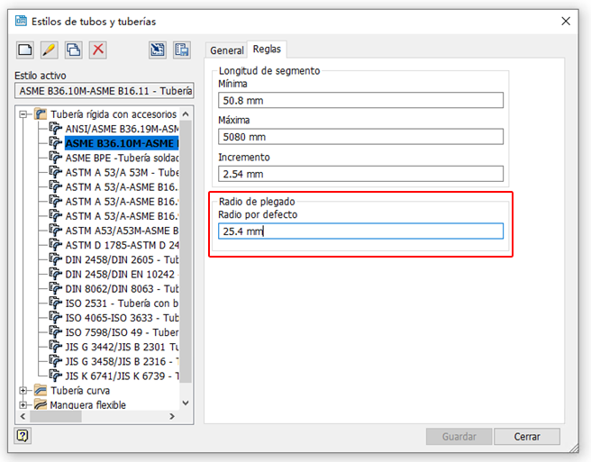 Ahora, todos los valores predeterminados de Radio de plegado se guardan en el estilo de Tubos y tuberías exportado. El radio de curvatura en el estilo de Tubos y tuberías se puede exportar a un archivo XML y también se puede importar.