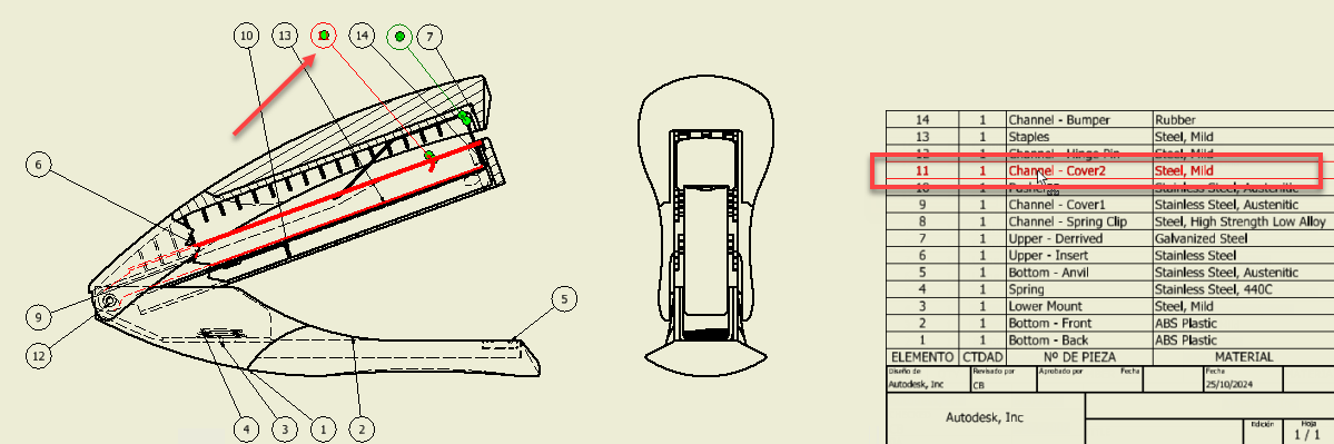 Al seleccionar una o varias filas de la lista de piezas, las referencias numéricas correspondientes se resaltan. El resaltado cruzado de referencias numéricas ayuda a encontrar fácilmente las referencias numéricas correspondientes a la fila de la lista de piezas seleccionada, lo que facilita la localización de la geometría de la pieza con referencias numéricas.