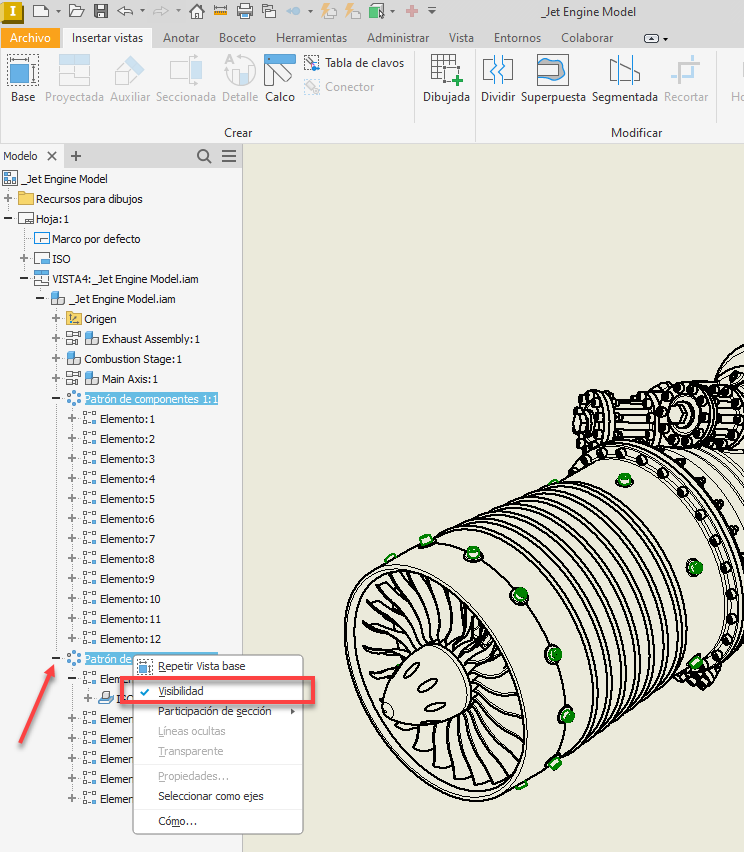 Ahora es posible seleccionar el patrón de componentes en el navegador de dibujos. Al seleccionar un patrón de componentes, se resalta la entrada del navegador para (solo) el patrón y todos los componentes de los gráficos que componen ese patrón (o patrón de patrones). Además, se han añadido las opciones Visibilidad y Seleccionar bordes al menú contextual.