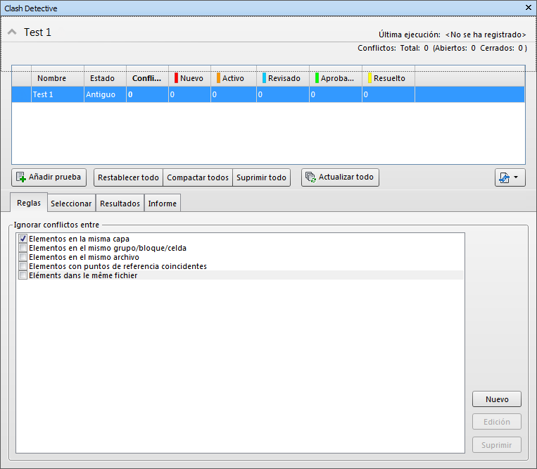 La ventana anclable Clash Detective permite definir las opciones de las pruebas de conflictos, ver los resultados, ordenarlos y generar informes.