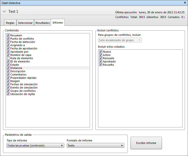 La ficha Informe permite configurar y generar informes con los datos de todos resultados de conflictos detectados en la prueba seleccionada.