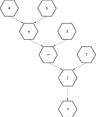 The application of DAGs and the evaluation classes is not limited to dynamic blocks. The following figure shows how to apply a graph to the evaluation of a mathematical expression. The binary operation nodes depend on value nodes or other binary operator nodes. Evaluating a binary operator node performs the indicated operation on the values of the preceding nodes, and returns the computed value. Thus a and b are multiplied by the multiplication (*) binary operator node, 3 is subtracted from this product by the subtraction (-) binary operator, and the result of this subtraction is divided by 7 to produce the final result x.