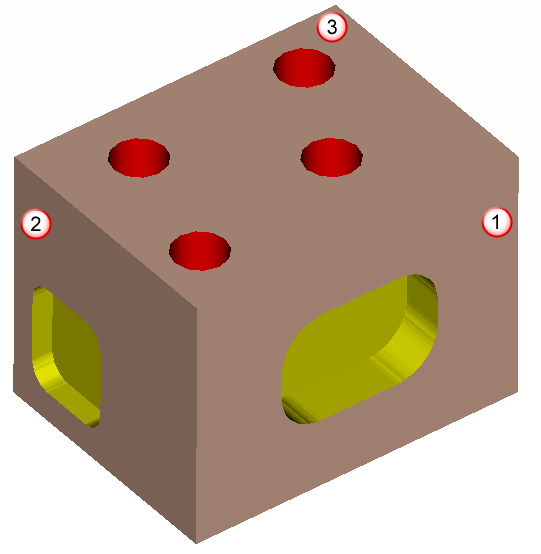 The following example shows the FRONT Face (shown above) programmed at a +90 orientation with respect to the solid model, so you need to select a value of 90 degrees as the Stock Positioning Angle on the Machining Table. The yellow coordinate system shows the solid model's origin, while the white coordinate system shows the programmed coordinate system. When transferring geometry from a solid model, it is transferred in the programmed coordinate system.