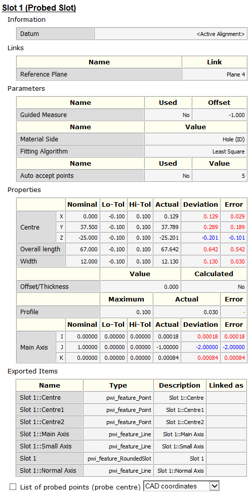 As with labels, when the measurements are compared to the item's nominals, different colours are used to indicate whether the measurements are above (red text), below (blue text) or within tolerance (green text). For example: