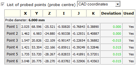 The positions, vectors, and deviation from form for each probed point. The Used column indicates whether the point is included in the item's measurement calculations. |