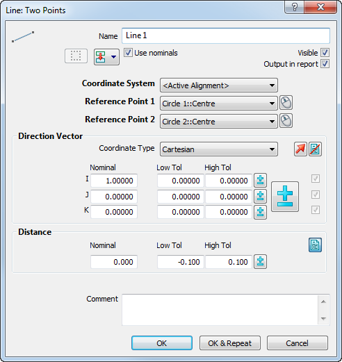 The line is created from the items selected in the Reference point 1 and Reference point 2 lists. In this case, the centres of the circles are used as the start and end points of the line, and the positive direction for the alignment's X axis runs from Reference point 1 to Reference point 2.