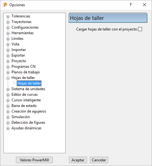 - En el cuadro de diálogo de Opciones, seleccione y expanda las Hojas de taller.