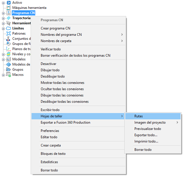 - En el menú contextual de Programas CN, seleccione Hojas de taller > Rutas.