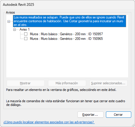 Expanda los elementos para ver los elementos individuales asociados a cada aviso. Al seleccionar el texto que se encuentra cerca del aviso, el elemento se resalta en todas las vistas abiertas en las que se muestre.