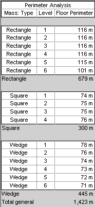 Utilice el procedimiento siguiente para crear una tabla de planificación con la que analizar el perímetro de las masas de un diseño conceptual. Los pasos requeridos en cada caso dependen de la información que se quiera mostrar en la tabla de planificación.