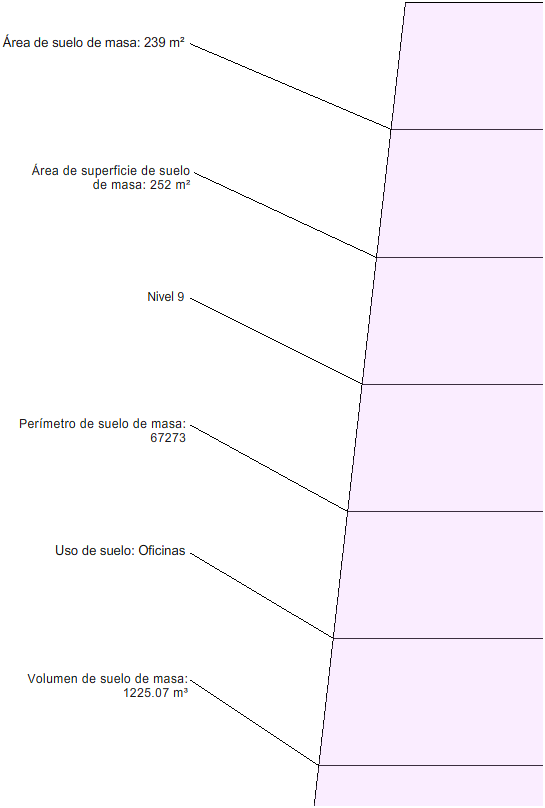 Después de crear suelos de masa, puede etiquetarlos en vistas 2D. Las etiquetas pueden incluir información de área, área de superficie exterior, perímetro, volumen y uso para cada suelo de masa.