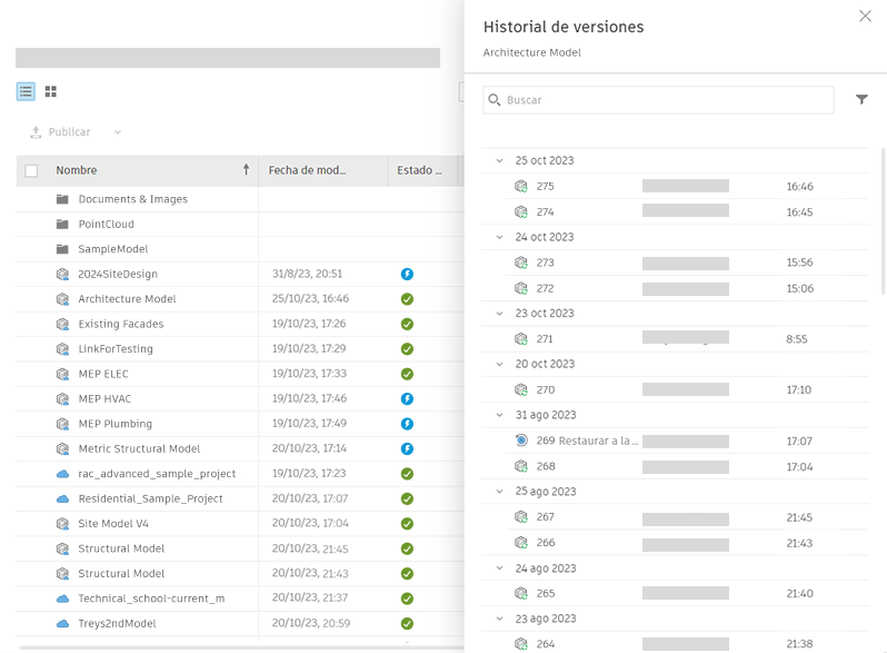 Puede utilizar el panel flotante del historial de versiones para las operaciones de búsqueda y filtrado. Los modelos se agrupan por fecha.