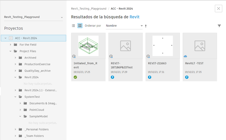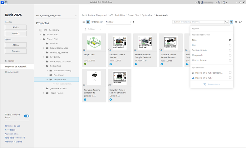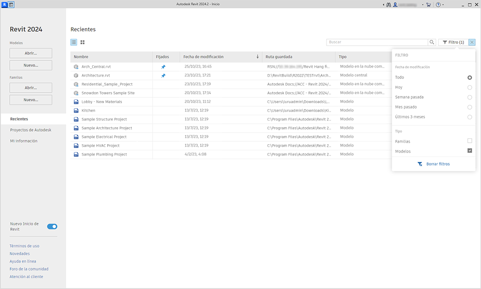- Busque archivos y proyectos, y filtre por fecha de modificación (Todo, Hoy, La semana pasada, El mes pasado, Últimos 3 meses) y tipo (Familias y Modelos).