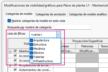 En función de los comentarios de los clientes, se han actualizado los filtros de disciplina del cuadro de diálogo Modificaciones de visibilidad/gráficos.