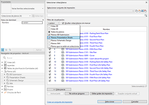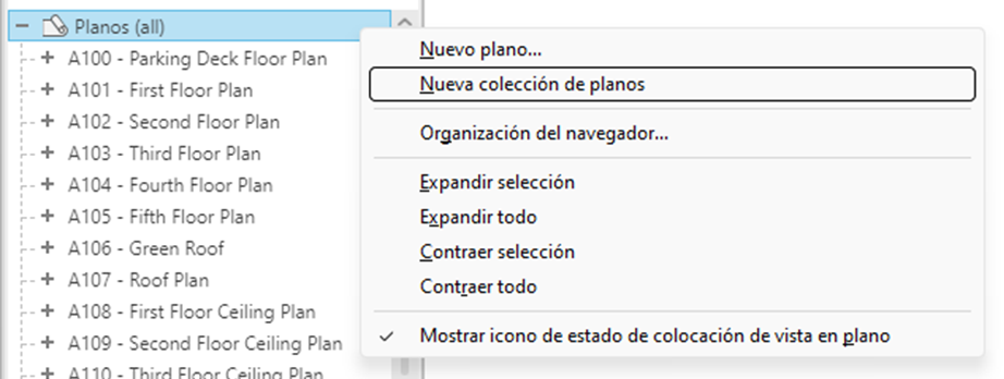 Los parámetros Colección de planos y Colección de planos de referencia están disponibles para los tipos de vista compatibles en Revit, junto con los parámetros de vista y plano existentes.